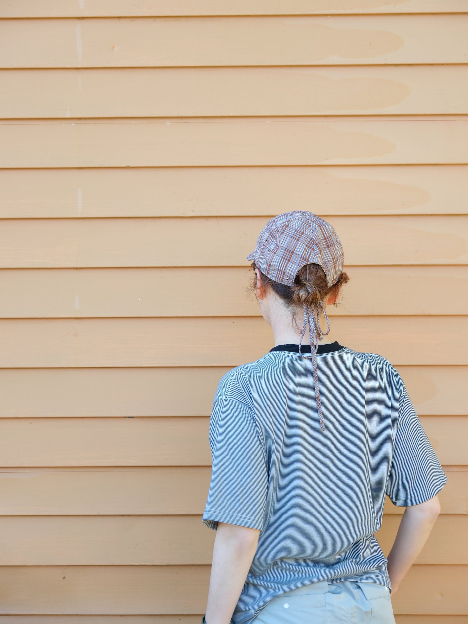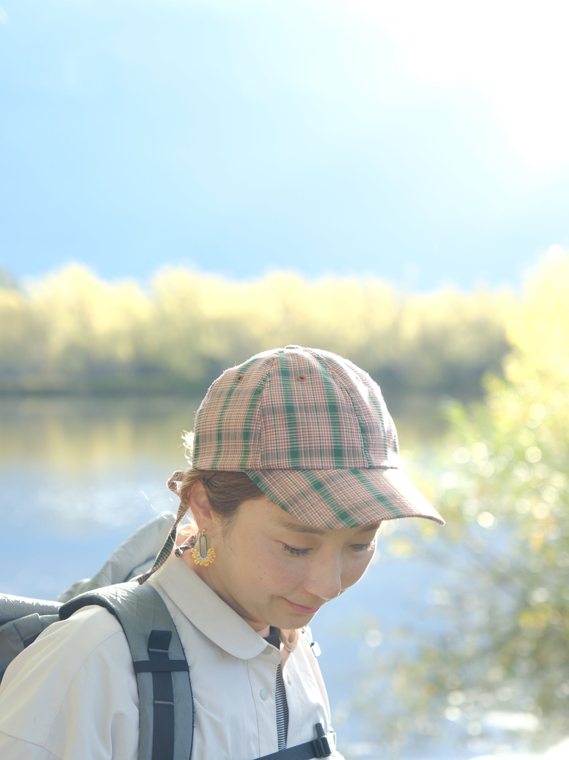 ベーシックなかたちに、チェック柄とリボンを施し、個性をもたせたハイキングキャップ。ややレトロな柔らかな雰囲気のチェック柄が、シンプルなコーディネートにも程よいアクセントになってくれます。素材は遮蔽率95.3%の紫外線カット機能に優れた化学繊維を使用。キャップ後部の頭周りの調整部分は、属のドローコードとリボンの両方で使用することができます。山のシチュエーションやその日の気分で付け替えが可能です。また、リボンはつばの両脇にあるスリットに通すことで、あご紐としても使用できる、3way仕様です。
