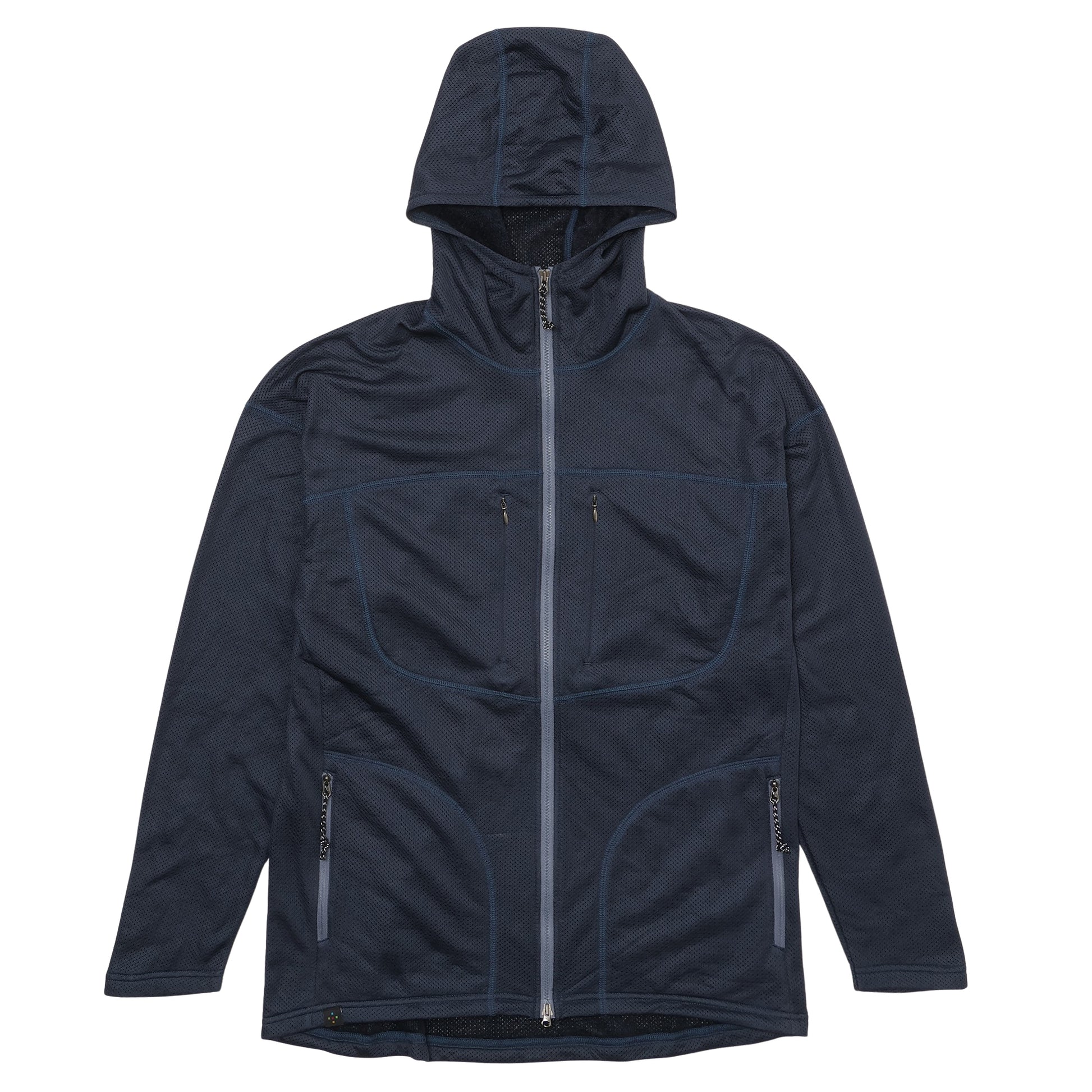こんなに風が抜けるのにほんのり暖かく、激しい運動にもオーバーヒートしないフーディーです。運動によって生じる汗を継続的に吸い上げて乾かすことができるので単体では蒸れ知らず、シェルを重ねると保温効果が得られる不思議なアイテムです。真夏には休憩中に汗を吸わせて乾かす羽織ものとして重宝します。春から秋までの長いシーズンで使用できます。