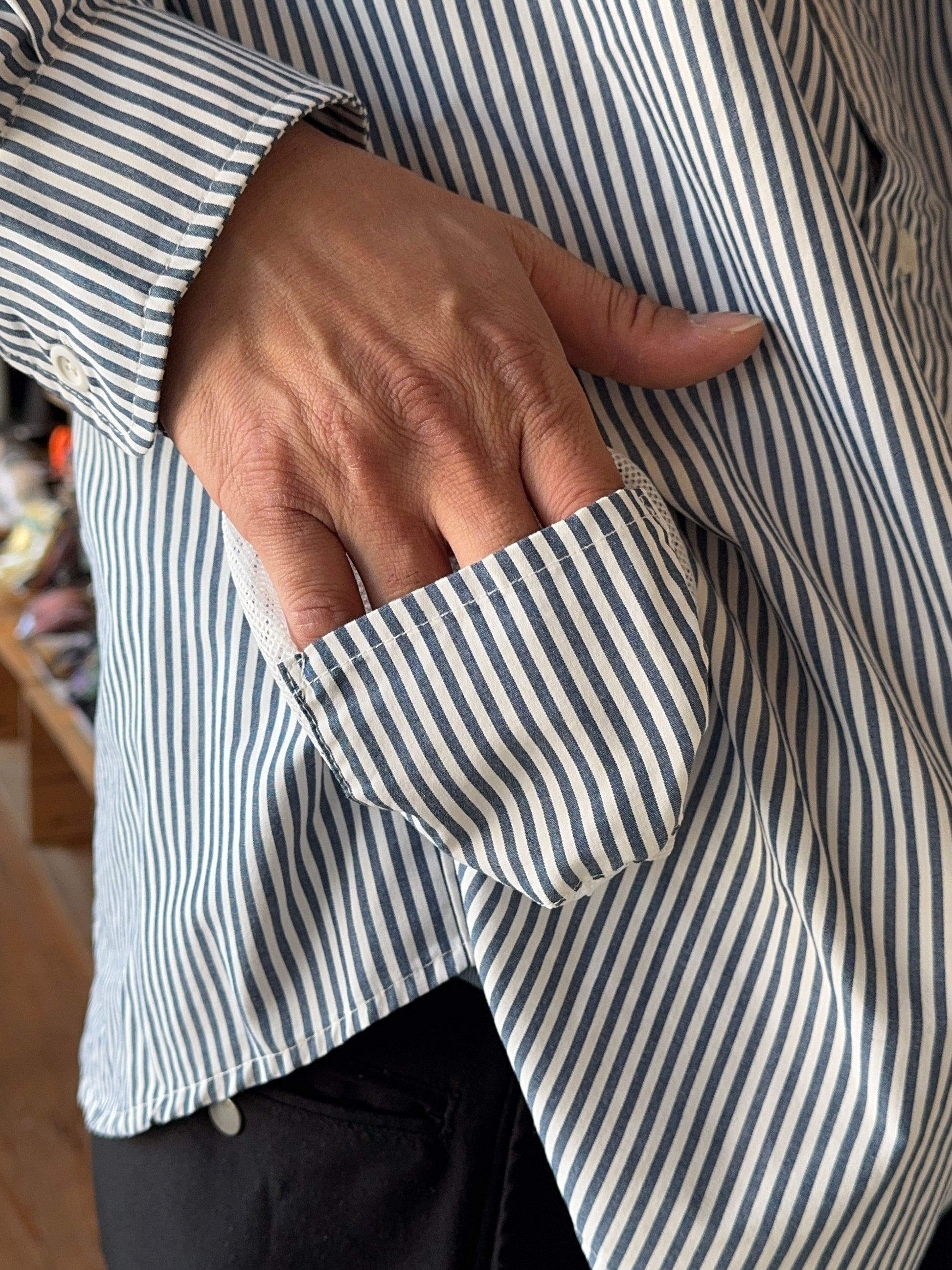 左胸にはクライミングマップやサングラスを収納できるようループ付きの大き目のポケットを配置、また、活動中に鍵や小物が落ちないよう止めることができるループを左腰ポケット内に付けました。