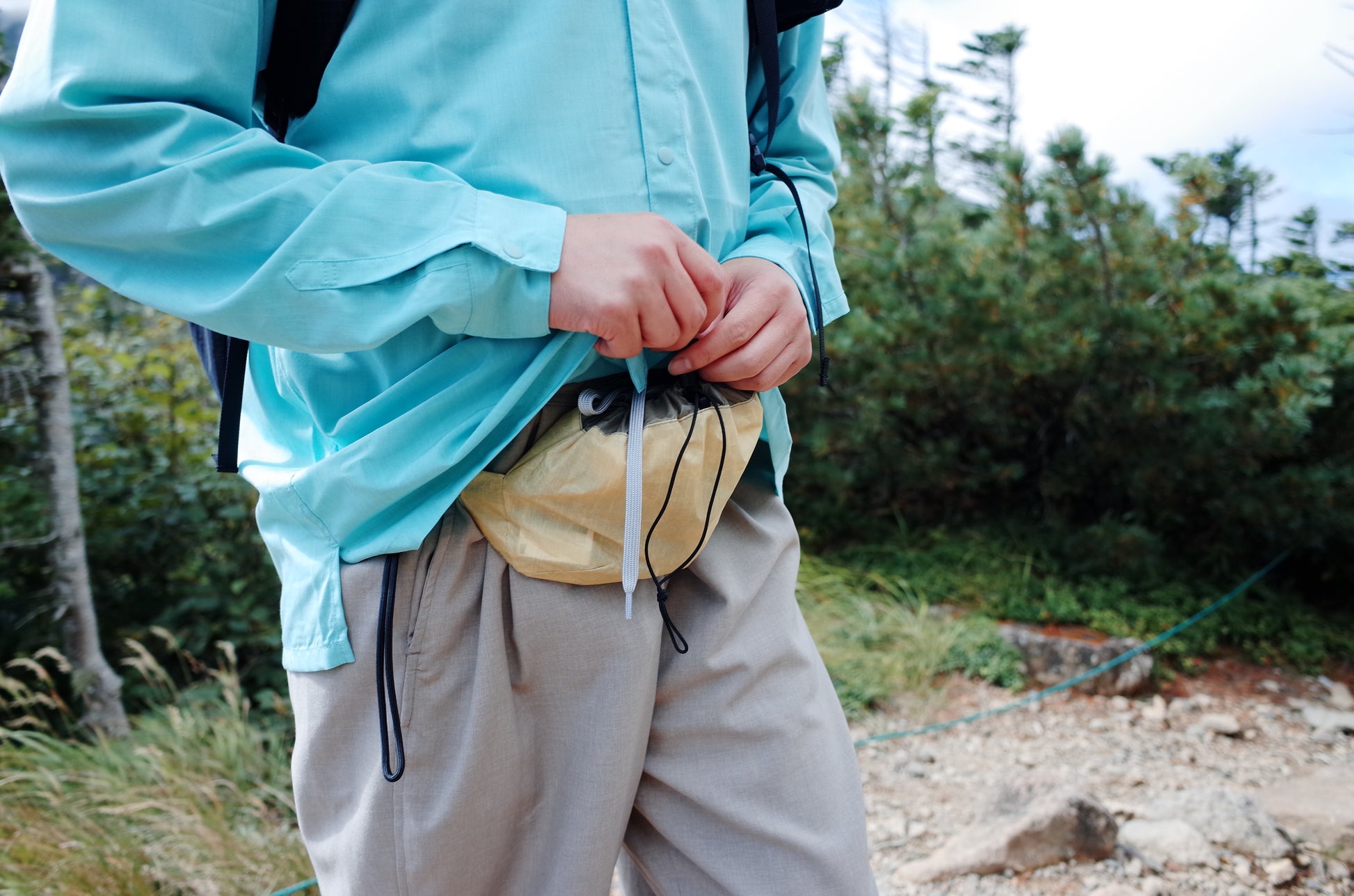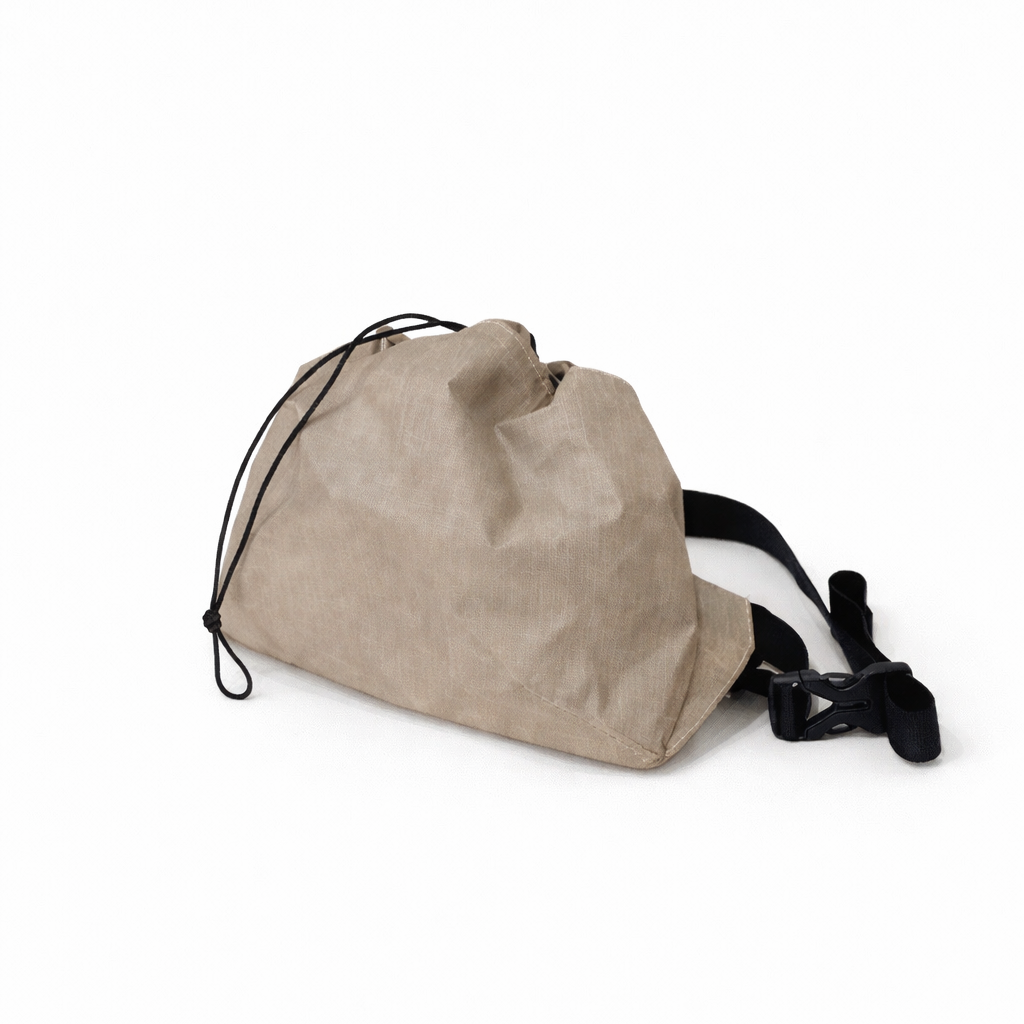 これまで主流だったジッパー式ではなく、紐で口を絞るドローストリング構造を採用。開閉がワンアクションで行えるため、歩行中でもスムーズに中身へアクセスできるのが大きな特徴。容量は「山と高原地図」が横向きにすっぽりと収まり、スマートフォンやコンパクトカメラ、行動食などを無理なく持ち歩けまます。